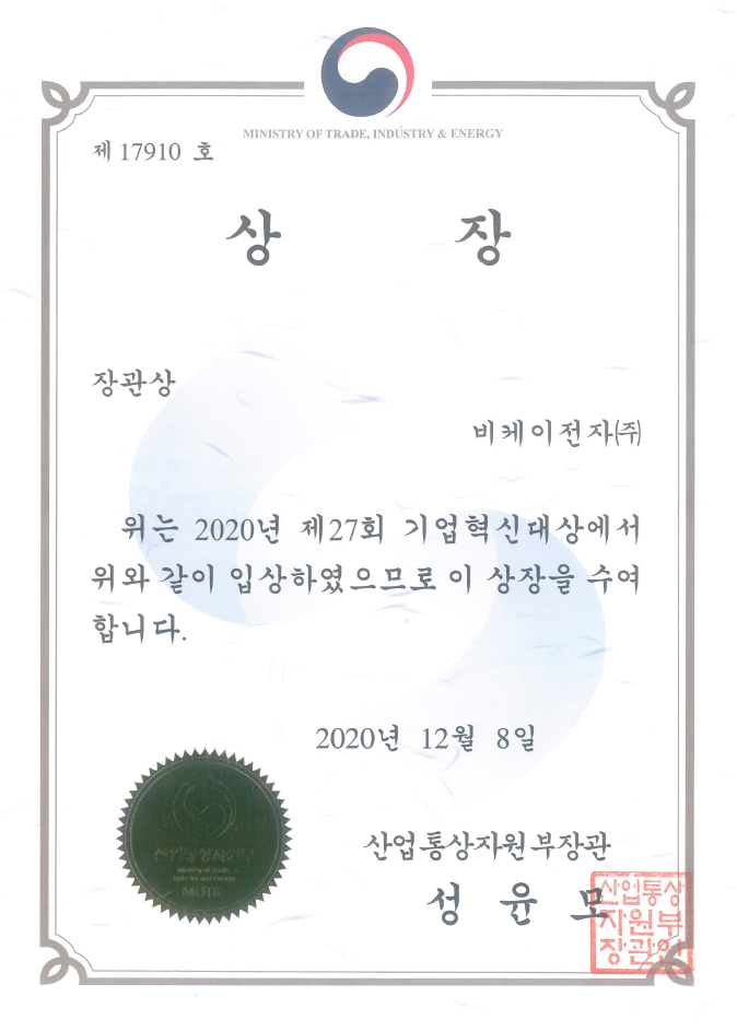 올해로 제 27회를 맞이한 기업혁신 대상을 수상한 비케이전자 기업의 경영혁신 우수사례를 발굴한 회사에게 주는 상으로 산업통상자원부와 대한상공희소 등이 주관하는 시상식으로 유병기사장님께서 수상하셨습니다.