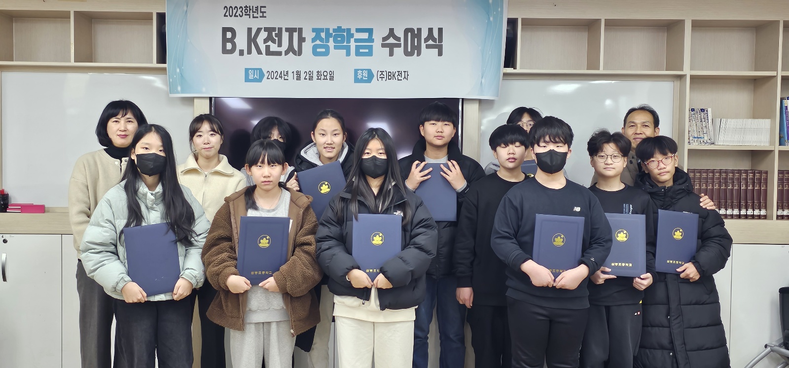 비케이전자는 안양시 3개 초등학교와 후원 협약을 맺고 매년 장학금을 수여한지 올해 20년이 되었습니다. 지역사회와 함께하여 성장하는기업 이라는 경영이념으로 모두가 행복해질 수 있도록 지속적인 사회공헌 활동을 펼쳐가겠습니다. ● 때. 곳 : 2024년 1월 2일~4일 / 학교 방문 ● 후원학교 : 삼봉, 석수, 박달 초등학교 ● 장 학 금 : 1,500만원(3개교) 각 학교마다 500만원 지급