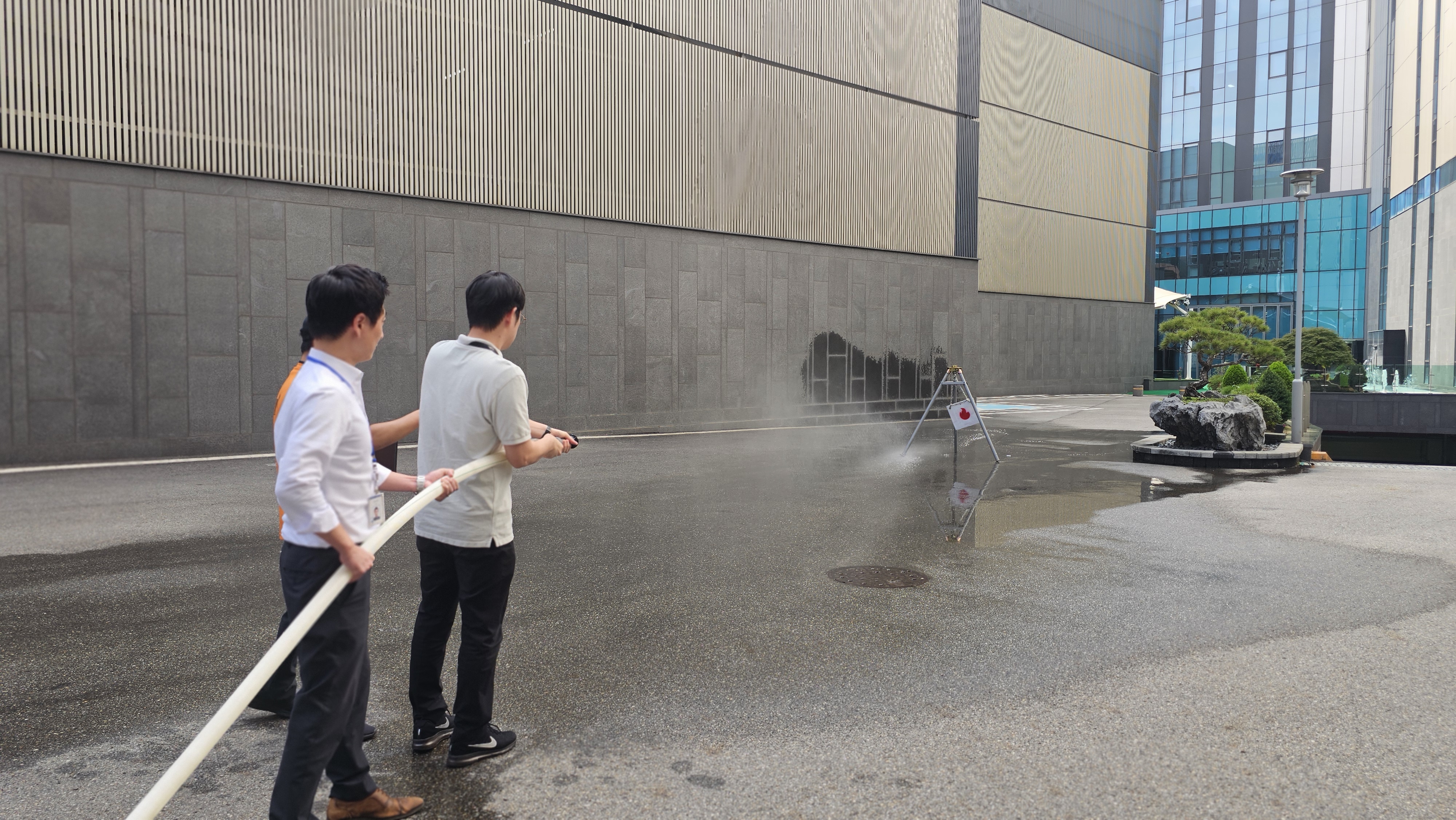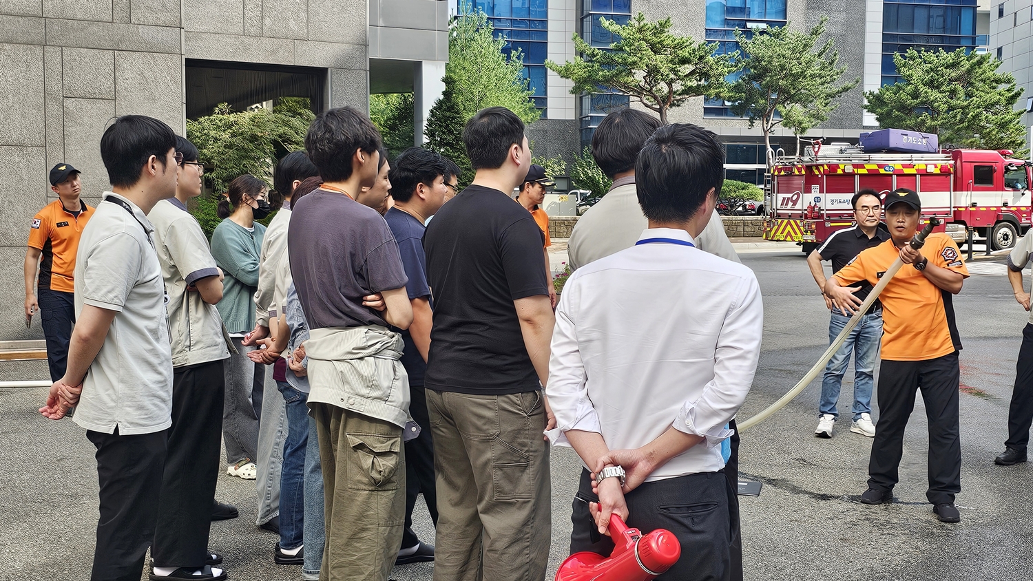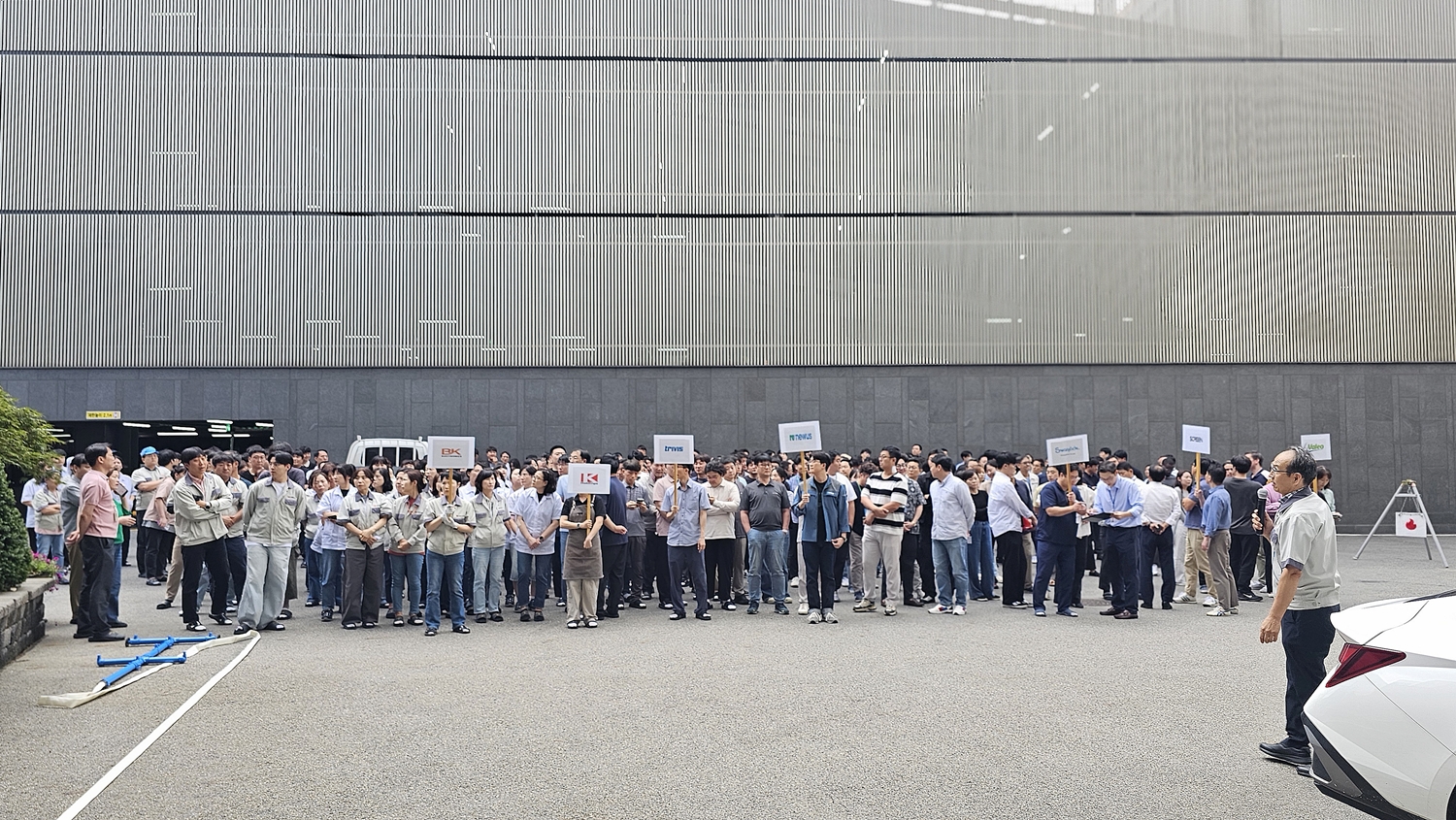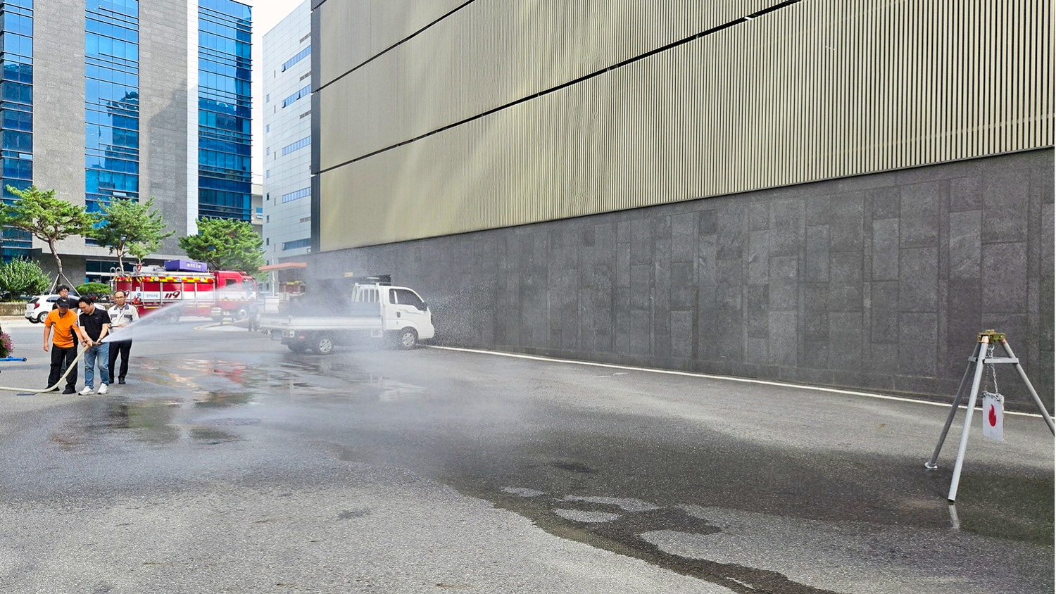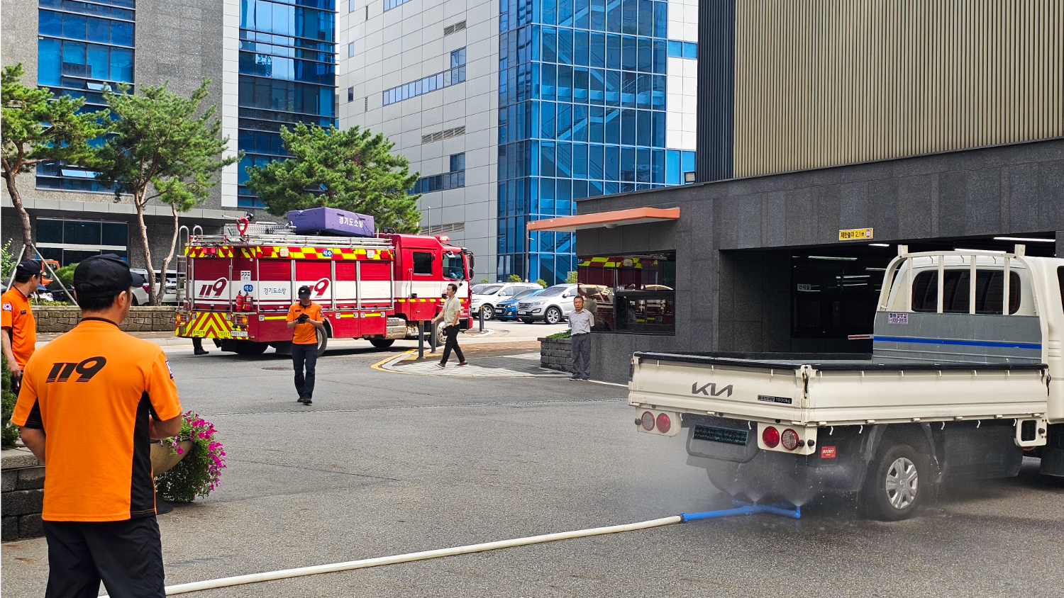 화재, 지진 등의 재난 대비 소방 훈련 실시 🚒 비케이전자는 재난 상황에 대비하여 매년 건물 전체 소방 훈련을 진행하고 있습니다. 지역 119 구급대원팀의 협조 하에 비상 대피 훈련 및 소화기 사용법, 진화조 방사 훈련을 실시하였습니다.