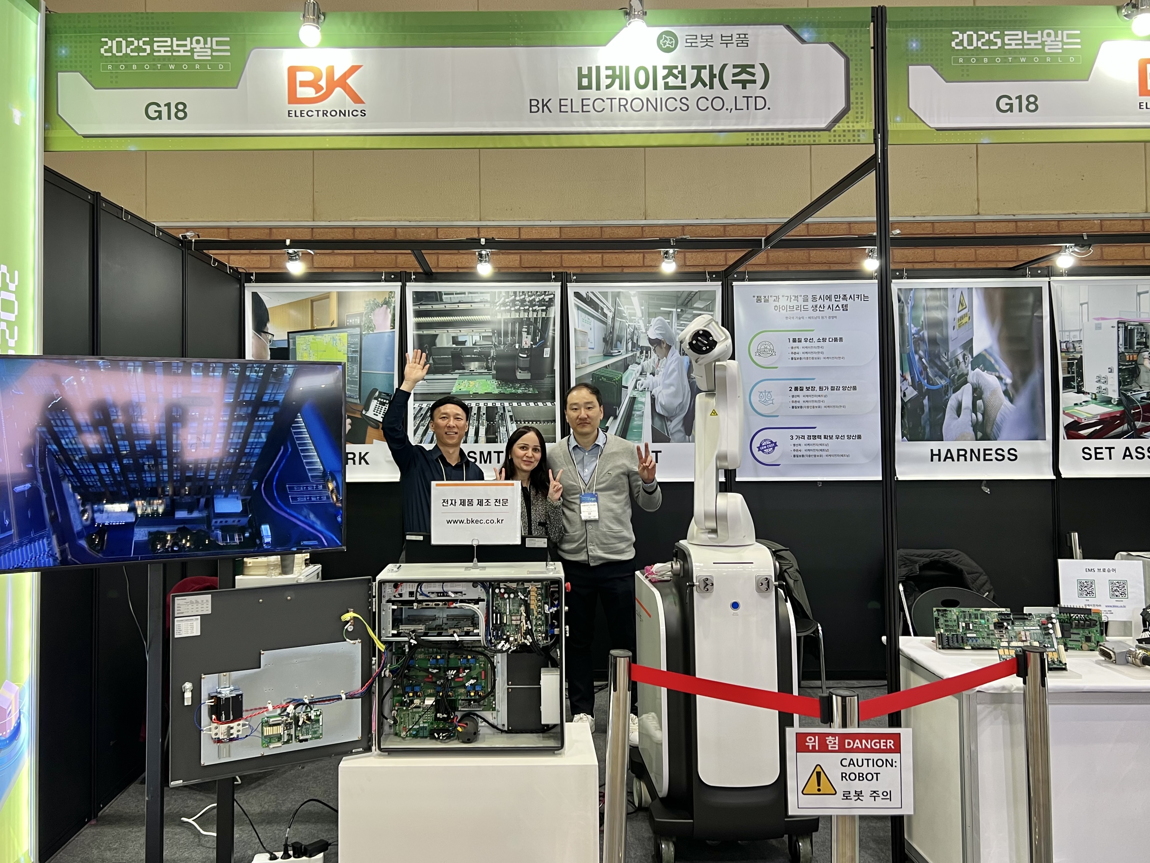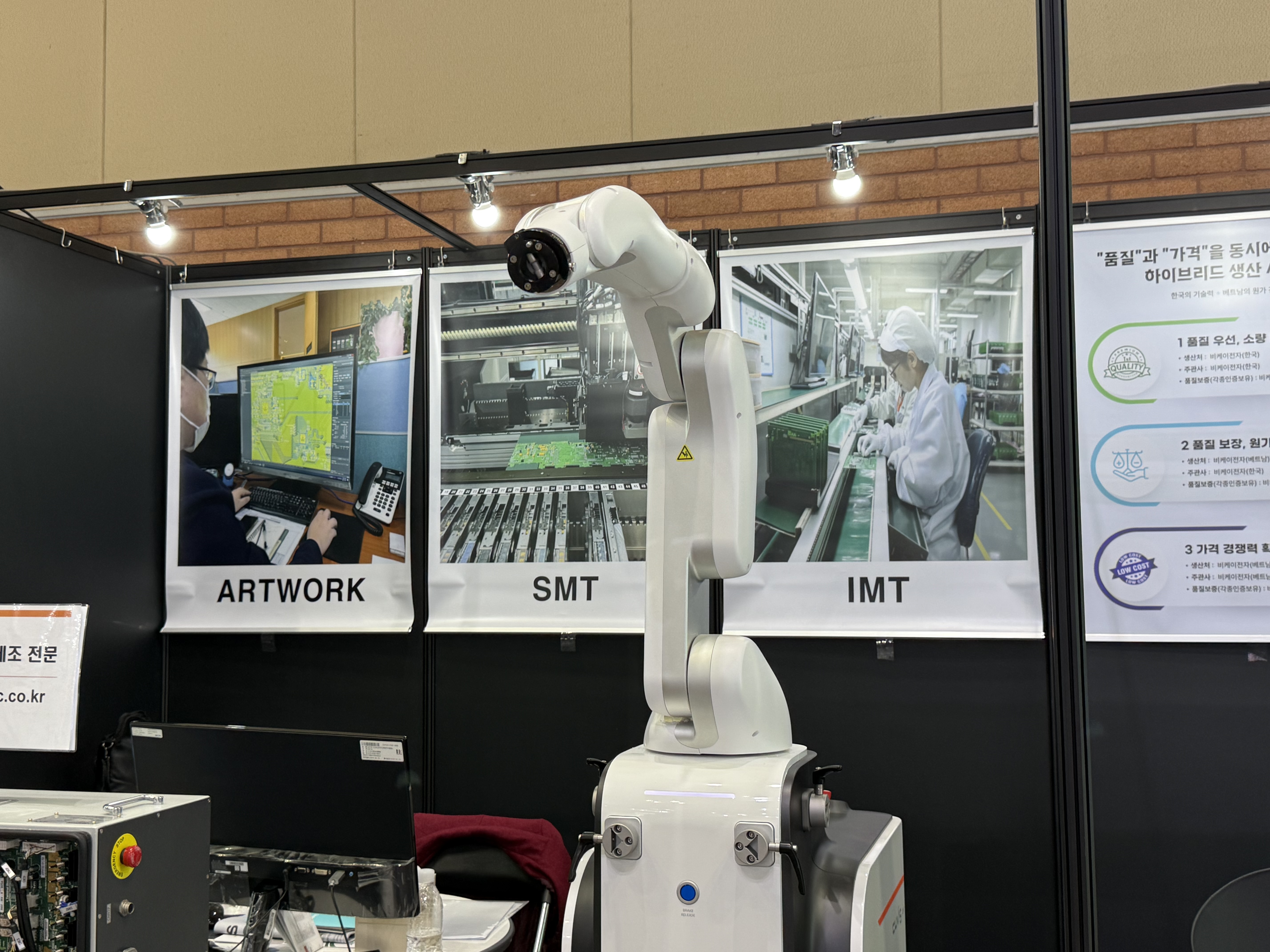 이번 전시회에서 가장 신경쓴 부분은 의료 로봇와 EMS(electronics manufacturing service)입니다. 관람객분들 역시 의료 로봇에 많은 관심을 주셨는데요. 저희 비케이전자는 자재수입검사부터 SMT, IMT, cable harness, 세트조립 및 출하까지 모든 과정을 책임지는 EMS 시스템을 갖추고 있습니다. 원하시는 일부 공정, 전체 공정을 통해 생산 가능한 제품의 영역대에 대한 문의를 많이 주셨는데요.