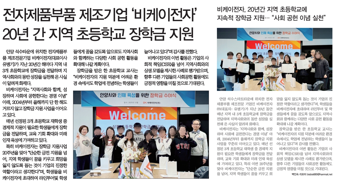 비케이전자는 지역 초등학교 3곳에 장학금 전달식을 진행하였습니다.